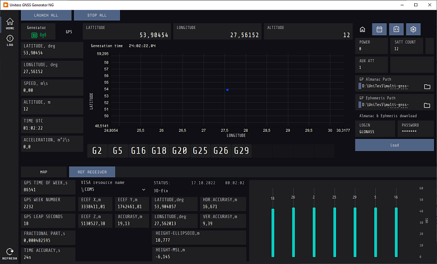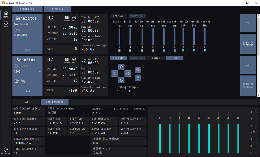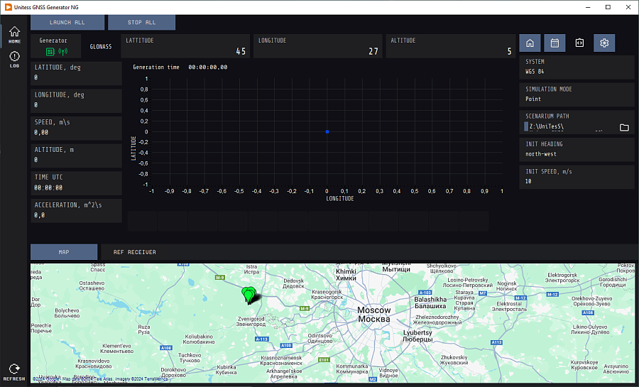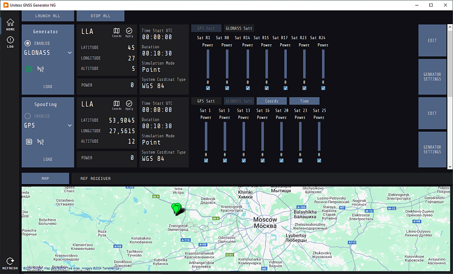 - Настройка параметров сигнала: мощность, количество спутников, временные параметры (время старта, длительность сценария).